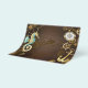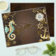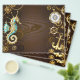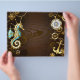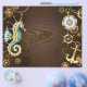 Fundo de madeira castanho com fundo marinho, cordilheira mecânica, volante antigo, âncora de ouro e diversas engrenagens de ouro e latão. Estilo Steampunk.