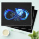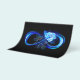 Luminous infinity symbol with glowing, beautiful, lushly blooming rose made of blue flames on black background.