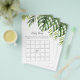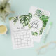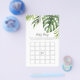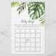 Este bingo de bebê de palma tropical selvagem é perfeito para um chá de fraldas de tema de praia. A design apresenta um conjunto exótico de folhas de palmeiras de banana-d'água verde, samambaias, folhagem, plantas botânicas e verde para uma sensação tropical de verão. Personalize a parte de trás do cartão com o nome da futura mãe e a data do chá.