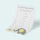 Nosso jogo de nomes de filhotes de elefantes amarelos e cinzas é excelente para qualquer chá de fraldas. Nossas cartas têm uma lista de 20 animais e linhas para os convidados escreverem. Faça seus hóspedes adivinharem como os bebês dos animais são chamados - é mais difícil do que você pensaria! Os animais de floresta nas cartas incluem uma raposa, alce, urso, guaxinim e coelho. CHAVE DE RESPOSTA: 1)Cub 2)Kitten 3)Pintinho 4)Calf 5)Fawn 6)Puppy/Pup 7)Duckling 8)Calf 9)Tadpole/Polliwog 10)Kid 11)Gosling 12)Foal/Yearling/Colt/Filly 13)Joey 14)Criança 15 iglet 16)Pup 17)Bunny/Kit 18)Lamb/Lambkins 19)Hatchling 20)Cub/Pup/Whelp