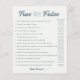 Teste o conhecimento de bebês dos convidados com este jogo divertido, verdadeiro ou falso, com fatos sobre bebês. Esta folha de jogo tem um tema náutico num esquema de cor azul e creme que é perfeito para chás de fraldas honrando mães a serem de meninos. A chave de resposta está abaixo. Não se esqueça de impressão desta página ou de marcá-la para referência para uso posterior. CHAVE DE RESPOSTA: 1. Verdadeira 2. Verdadeira 3. Falso (apenas bebês humanos sorriem) 4. Verdade 5. False (a primeira cor que as crianças reconhecem é vermelha, a última é azul e roxa) 6. Verdadeiro (os recém-nascidos não produzem lágrimas até cerca de 3 semanas) 7. Falso (o estômago de um bebê tem cerca do tamanho de uma noz) 8. Verdade 9. Falsos (as suas papilas gustativas reconhecem doce, amargo e azedo, mas não salgado) 10. Verdade 11. Verdade 12. Falsa (mais susceptível de virar para a direita) 13. Verdade 14. Falso (é à volta da boca) 15. TRUE
