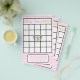 Jogos de Chá de Bebê Borboleta rosa e dourado. O lado um é Bingo de Chá de Bebê e o lado dois é "Quem conhece melhor a mamãe?".