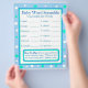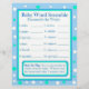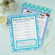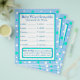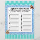Primeiro lado: o templo azul e verde Baby World Scramble. Respostas às palavras são: 1. garrafa 2. fralda 3. playpen 4. rattle 5. stroller 6. fórmula 7. um lado 8. lullaby 9. berçário 10. pacificador 11. solteiro 12. precioso Segundo lado: arco roxo Nome do alfabeto Jogo Dê aos seus hóspedes dois minutos para escrever tantos nomes quanto puder começar por cada letra.