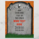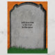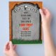 Este design assustador de festa de Halloween mostra uma lápide / pedra tumular com uma caveira e ossos cruzados e as palavras "Aqui jaz..." O fundo atrás do túmulo é laranja manchado com grama na parte inferior. Adicione os detalhes da sua celebração usando os campos do modelo ou exclua as amostras de texto do modelo para deixá-los em branco. Se você ama cemitérios góticos e festas assustadoras de Halloween, este é o design sinistro para você. Veja itens correspondentes em nossa loja!