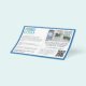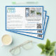Folheto informativo para a sua pequena empresa com muito lugar para o seu texto personalizado de um lado, juntamente com o seu logotipo, código QR e uma fotografia. Do outro lado, uma foto maior, um endereço de site e um slogan ou texto mais curto. Uma borda azul que enquadra o folheto promocional focado no texto personalizado com seu logotipo, site, fotos e código QR. Altere o texto e as fotos neste modelo de folheto prático para que seus clientes e clientes saibam sobre seus negócios e/ou vendas, ofertas ou campanhas atuais.