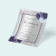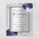 Por favor, note que este convite está no papel de folheto e é muito fino. Os envelopes não estão incluídos. Para convites mais espessos (mesmo design) visite nossa loja. Fundo de aspecto fino prateado decorado com flores azuis e azuis-marinhos, flores e brilho fino prateado, brilhos. Personalize e adicione seus nomes e detalhes do casamento. Letras negras.