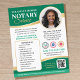 Os folhetos de marketing são uma forma excelente de anunciar seu negócio notarial e atrair novos clientes. Esta design na moda mostra seu dentro de fotos com um quadro circular, com um elegante gradiente dourado. Personalize o modelo com seu nome, credenciais, informações de contato, logotipos de acreditação, serviços e um código de QR conveniente para agendamento de compromissos. O texto pode ser personalizado para se adequar à sua empresa. Perfeito para um notário público, agente de assinatura de empréstimo, notário móvel, agente de entrega de confiança notarial certificada (CNTDA), fiscal ou outra profissão jurídica. Cores impressas: verde, dourado, preto e branco. Compre a coleção on-line para obter ideias e suprimentos de produtos mais populares, projetados para notários!