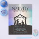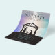 Natividade Um Rei é o Nascer da Igreja no Dia de Natal Serviço Folheto Religioso com Tons Suaves de Fundo Azul, Púrpura e Amarelo e Cena de Natividade.