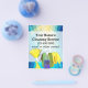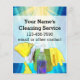 Personalize este produto colorido de promocional a cores de cheio com o nome e os detalhes da sua empresa de limpeza ou limpeza. Apresenta aqua e raios azuis brilhantes de fundo claro com uma mão cor-de-luva amarela segurando duster de penas, um balde verde com pano e uma solução de spray azul.