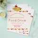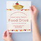 Um folheto para uma unidade de comida fornecida por uma organização, empresa ou outro grupo. Este folheto da unidade de comida solicita comidas não perecíveis e não expiradas. Inclui a data e a hora do evento e a localização. Ele apresenta uma torta de maçã sorridente e folhas coloridas de queda.