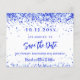 Observe que esta opção Save the date (Salvar a data) está no papel do folheto e muito fina. Os envelopes não estão incluídos. Para Cartões salve a data mais espessos (mesmo design) visite nossa loja. Um fundo branco chic decorado com confete azul real. Personalize e adicione uma data e nome/idade. O texto: Salvar a Data é gravado com um script de estilo com letra de tendência grande. Texto azul real.