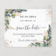 Observe que esta opção Save the date (Salvar a data) está no papel do folheto e muito fina. Os envelopes não estão incluídos. Para Cartões salve a data mais espessos (mesmo design) visite nossa loja. Um casamento de moda Salve a Data. Um fundo branco na moda, decorado com folhagem de eucalipto, folhagem de ouro e pó de dourado falso. Personalize e adicione uma data, nomes e texto. O texto: Salvar a Data é gravado com um script de estilo com letra de tendência grande com alternâncias.