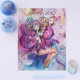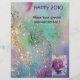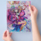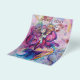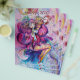 Colorido, caprichoso, engraçado palhaço rosa tocando corneta com uma coruja expressiva e notas musicais alegres, flores, folhas em cores vibrantes vermelho, fúcsia, violeta, roxo, azul, branco, pintura em aquarela por Bulgan Lumini (c)