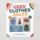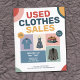 A colorful flyer advertising for a used clothes sales features subtle geometric patterns in soft pastels. The layout features a collage of various secondhand garments including vintage jacket, floral dress, and shirts arranged in an appealing grid format.
