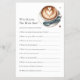 Adicione um toque de sofisticação ao seu jogo de perguntas para chá de noiva com este charmoso cartão de trivia "Você Conhece a Noiva". Perfeito para um tema de café ou evento com tema de café, este design elegante apresenta ilustrações de grãos de café, lattes e expresso em aquarela na frente, com divertidas perguntas "Quem Conhece Melhor a Noiva" no verso.