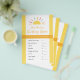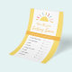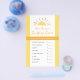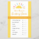 É hora do jogo! Estas brilhantes e ensolaradas folhas de jogo darão ao seu chá de fraldas ou lançarão um olhar coeso - e facilitarão o planejamento do partido! Campos editáveis para que você possa ajustar os nomes dos produtos, se desejar. Este design faz parte da coleção de Chás de fraldas "Tiny Miracle Sunshine" com tons amarelos neutros em termos de gênero.