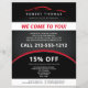 Uma ilustração fluida de um carro esportivo vermelho em preto é combinada com seu nome ou nome comercial para um logotipo instantâneo neste folheto personalizável. Anúncios de excelente para seus negócios de automobilística móvel, reparo de carros, lavagem de carros ou automação. Personalize o texto e a promoção para a sua oferta exclusiva. Este design de frente e verso oferece bastante espaço para seus detalhes e listas de preços. Design original © 1201AM Design Studio | www.1201am.com