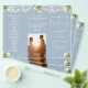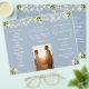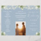 Este elegante programa de casamento trifold apresenta folhagens florais e luzes de corda em um fundo azul empoeirado. Projetado por Thisisnotme©