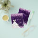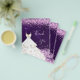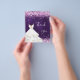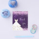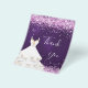 A feminine and elegant birthday thank you note. A purple, uneven colored background color. With pink faux glitter, sparkles and a white drerss. On front a large hand lettered script and the text: Thank You.