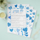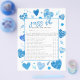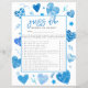 Concebido para combinar com os nossos convites para chá de bebê 'Sweetheart'. Este fofo jogo 'Quem é?' Mamãe ou Papai para chá de bebê, apresenta ilustrações em aquarela de uma variedade de corações com padrões em tons de azul. Todas as perguntas podem ser editadas, então se quiser alterá-las, você pode! Todo o texto pode ser personalizado usando o modelo fornecido; os estilos de fonte e a cor do fundo também podem ser alterados clicando no link personalizar mais após a personalização. Divirta-se e comece a adivinhar!
