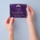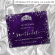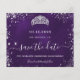 Um Salve o Dia feminino e moderno para uma Quinceañera, festa de 15 anos. Um fundo roxo de cor irregular. Decorado com pó de brilho de prata falso e uma tiara, coroa. O texto: Salve a Data é escrito com um estilo de letra manuscrita grande e moderno.