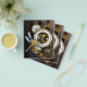 Marcações antigas com engrenagens de ouro e latão, decoradas com libélula mecânica sobre fundo castanho e listrado. Steampunk.