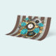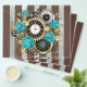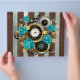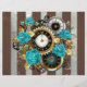 Relógio antigo estampado, adornado com joias, ponteiros de horas dourados e numerais latinos com rosas turquesa em fundo marrom listrado. Estilo Steampunk.