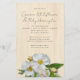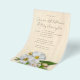 Convites para casamento de orçamento com um fundo de madeira rústico e rosa de praia branca. O casal convida os convidados nesta redação, com "por favor, juntem-se" no topo. Os nomes dos cheios da noiva e do noivo estão em letra moderna de escrita manual. O texto da cerimônia, com data, hora, local e RSVP, se preferir, é impresso em maiúsculas.