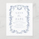 Anuncie seu dia especial com um floral inspirado na Vitoriana, salve a data em elegante azul empoeirado. Este design de inspiração francesa apresenta padrões florais complexos que evocam romance e sofisticação do eterno. A cor azul suave e poeirenta adiciona um toque sereno e refinado, perfeito para dar o tom de um casamento clássico e elegante. Ideal para casais que buscam um estilo gracioso, mas único, isto salva a data combina o charme de vintagem com a beleza moderna, garantindo que seus convidados antecipem uma celebração verdadeiramente especial.