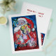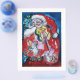 Pintura colorida, branca e artística em acrílico, Papais noeis estão tocando violino na noite de inverno nevada, coruja, ornamentos florais, plantas de inverno, bagas ocas em cores vermelho brilhante, verde, branco, azul, amarelo.