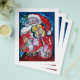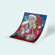 Pintura colorida, branca e artística em acrílico, Papais noeis estão tocando violino na noite de inverno nevada, coruja, ornamentos florais, plantas de inverno, bagas ocas em cores vermelho brilhante, verde, branco, azul, amarelo.