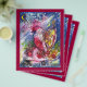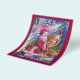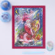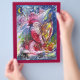 Pintura colorida, branca e artística em acrílico, Papais noeis estão tocando harpa à lua, coruja, ornamentos florais, plantas de inverno, brinquedos para crianças, bagas holly em cores vermelho vivo, verde, branco, azul, amarelo. por Búlgaro Lumini (c)