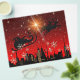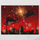 Papai Noel com sua Reindeer voando em um trenó sobre a cidade. Céu vermelho noturno e flocos de neve. frontiernow.com