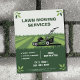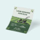 Um folheto de serviços de corte de grama profissional com design vibrante, com pequenos acentos de folhas nos cantos. O centro apresenta uma ilustração de um gramado perfeitamente cuidado com linhas de corte nítidas e um cortador de grama. Pode ser adequado para serviços de cuidado com gramados e jardinagem profissional ou pessoas que trabalham no campo da paisagem, como paisagista, cortando e mantendo o gramado, mantendo espaços verdes, etc.