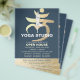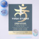 Meditação YOGA Instrutor Studio Open House Flyer Modelo - Elegante Faux Gold Foil Yoga Meditation Magical Root Chakra Symbol / Muladhara Chakra Symbol / Seed Mantra LAM Sanskrit Letter with Meditation Pose / Tree Pose on Marinho Blue Color Background.