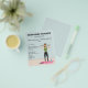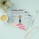 A ilustração de desenho de Destei de uma linda garota morena que está segurando buracos em suas mãos. A garota está parada em um tapete cor-de-rosa que tem dois sinos e uma garrafa de água azul. Há também muitos campos de texto personalizáveis para texto e informações personalizadas.