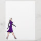 Desenho ou desenho clássico de ilustração Vintage em quadrinhos. Uma garota glamourosa pega uma garota loira de bombardeio com o cabelo puxado de volta para uma grave cauda de pônei. Uma secretária vestida durante um dia no escritório vestindo um belo terno profissional roxo, óculos, luvas longas, calçados de salto alto e pronto para o negócio como de costume no escritório.