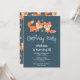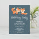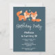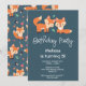 Convite de aniversário com ilustração gráfica de 2 raposas laranjas parecendo fofas e felizes.