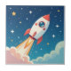 Foguete vermelho e branco fofo decolando no espaço com estrelas e nuvens caprichosas.