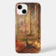Raios de luz quente do sol do outono passam pelas árvores amarelas e vermelhas na borda da floresta e iluminam as folhas caídas no chão da floresta. Mais profundo na floresta onde as sombras são mais escuras ainda há vislumbres de ouro e cremson.