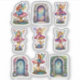 Uma estética encantada e suave define esta folha de adesivos de efêmeros para scrapbook, apresentando uma coleção de recortes de portas de fadas que parecem ter sido tiradas diretamente de um reino florestal escondido. Cada porta miniatura é feita com molduras de pedra desgastada, suas bordas texturizadas dando a impressão de caminhos antigos esculpidos em encostas musgosas. Vinhas de rosa sobem graciosamente pelas laterais, suas flores desabrochando em tons suaves e românticos que adicionam um toque de capricho delicado a cada vinheta.