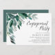 Os convites de festas de noivado botânica elegantes apresentam folhas de cor aquática de eucalipto e folhagem verde em cascata do canto superior esquerdo. Personalize com seus detalhes de celebração de noivados alinhados à direita e embelezados com o script de caligrafia. Convites invertendo ao verde florestal sólido.