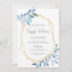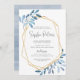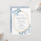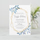 Os bonitos convites para bebês neutros em termos de gênero incluem a inscrição de cinzas enquadrada por uma falsa borda geométrica dourada e folhagem azul-clara, folhas e bagas brancas. Uma escolha moderna num esquema natural de cores para os chás de fraldas do tipo boho ou da natureza.