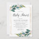 Na moda e chá de fraldas elegante com folhas de aquarela e ramos em tons vibrantes de verde escuro e lacre. Uma incrível estrutura de folha de ouro falso rodeia os detalhes do seu chá de fraldas para uma aparência perfeita para chás de fraldas de primavera e verão.