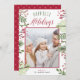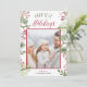 Cartão com fotos festivo apresenta bagas, folhas e galhos pintados com aquarelas, ao redor de sua foto favorita no centro. "Feriados Mais Felizes" aparece no topo em blocos e tipografia de script, com letra vermelha e verde. Personalize com sua saudação e nomes personalizados na parte inferior.