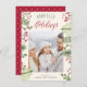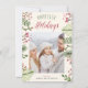 Cartão com fotos festivo apresenta bagas, folhas e galhos pintados com aquarelas, ao redor de sua foto favorita no centro. "Feriados Mais Felizes" aparece no topo em blocos e tipografia de script, com letra vermelha e verde. Personalize com sua saudação e nomes personalizados na parte inferior.