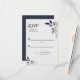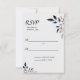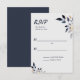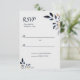 Folhas Azuis com Cartão RSVP de Casamento Dourado desenhado com folhas delicadas e suaves em tons de Marinho Escuro, Azul Claro e sotaques dourados. O texto inclui: RSVP, Responder por Data e espaço para os convidados adicionarem seus nomes. Para personalizar, basta inserir sua Data de Resposta no nosso modelo fácil, substituindo o texto de amostra. Certifique-se de visualizar todas as Folhas Azuis com a Coleção de Casamentos Dourados para partes correspondentes.