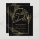 Apresentando um item de casamento black tie formalmente suave com cores preto e dourado adornado com delicadas folhas de esqueleto dourado sobrepondo as bordas de uma moldura arqueada. Este design faz parte de uma coleção coordenada e inclui itens como cartões de RSVP, avisos de "salve a data", convites, sinais de boas-vindas, adesivos, guardanapos, programas, cartões de número de mesa, sacos de lembranças, menus e rótulos de garrafa de vinho, bem como uma variedade de tipos de cartões e papéis para se adequar a qualquer orçamento.