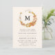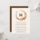 Convites de casamento outono elegantes e rústicos com uma coroa de folhas e galhos quentes do outono em torno do seu monograma personalizado e detalhes de casamento mostrados abaixo. O verso do convite apresenta uma cor de fundo castanha escura contrastante.