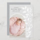 O anúncio de natalidade chic e moderno apresenta uma foto vertical/retrato solteiro em um layout arquitetado, com vinhas subindo de folhas botânicas brancas ao longo do lado direito. Personalize com o nome do seu bebê, data de nascimento e estatísticas, e adicione uma mensagem pessoal às costas, juntamente com uma foto adicional.